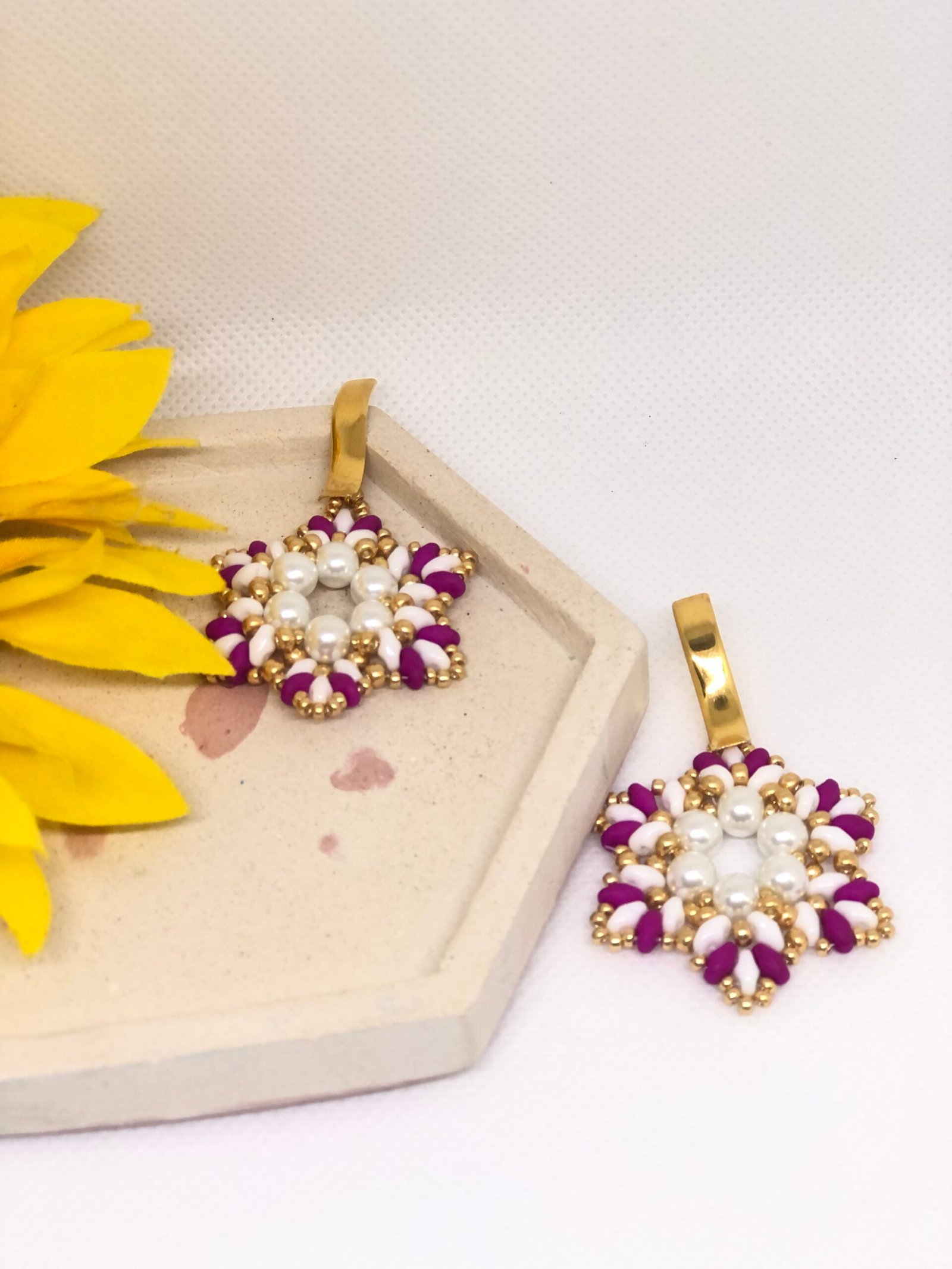 Les boucles d’oreilles Ella sont une création artisanale composée de perles et de super duo , soigneusement assemblées en une étoile harmonieuse aux tons mats . Ce design moderne et graphique apporte du caractère tout en restant facile à porter.